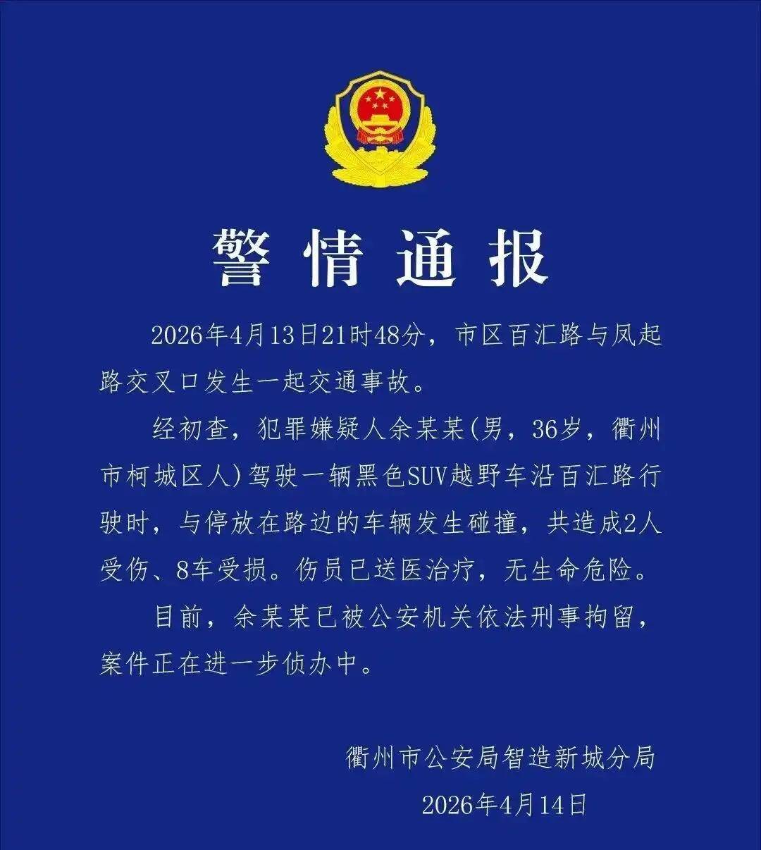 4月14日,浙江衢州市公安局智造新城分局发布警情通报:2026年4月13日21时48分,市区百汇路与凤起路交叉口发生一起交通事故。经初查,犯罪嫌疑人余某某(男,36岁,衢州市柯城区人)驾驶一辆黑色SUV越野车沿百汇路行驶时,与停放在路边的车辆发生碰撞,共造成2人受伤、8车受损。伤员已送医治疗,无生命危险。目前,余某某已被公安机关依法刑事拘留案件正在进一步侦办中。