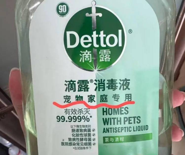 陈女士发布的照片显示,她使用的滴露消毒液宣称“宠物家庭专用”,电商平台官方旗舰店宣称“舔舐无毒”。
